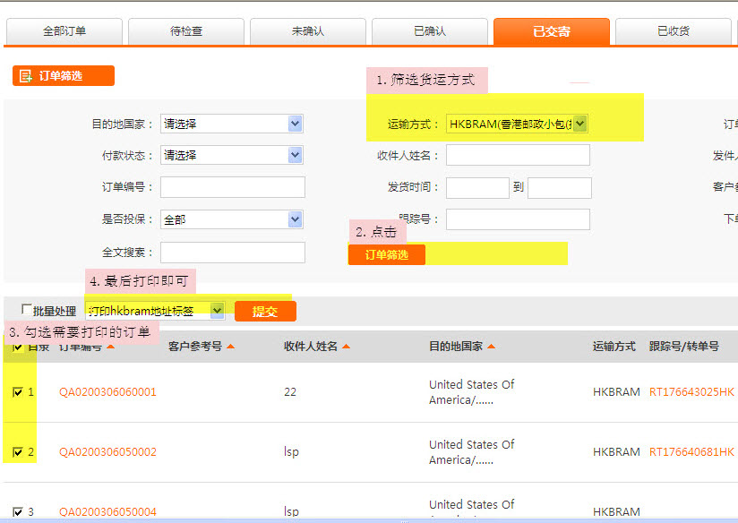 From now on, when you print HKBRAM address label in the confirmed status, the tracking bar code will generate on the address label automatically. If you print the address label in bulk, please choose "HKBRAM" of delivery method firstly then print it out.